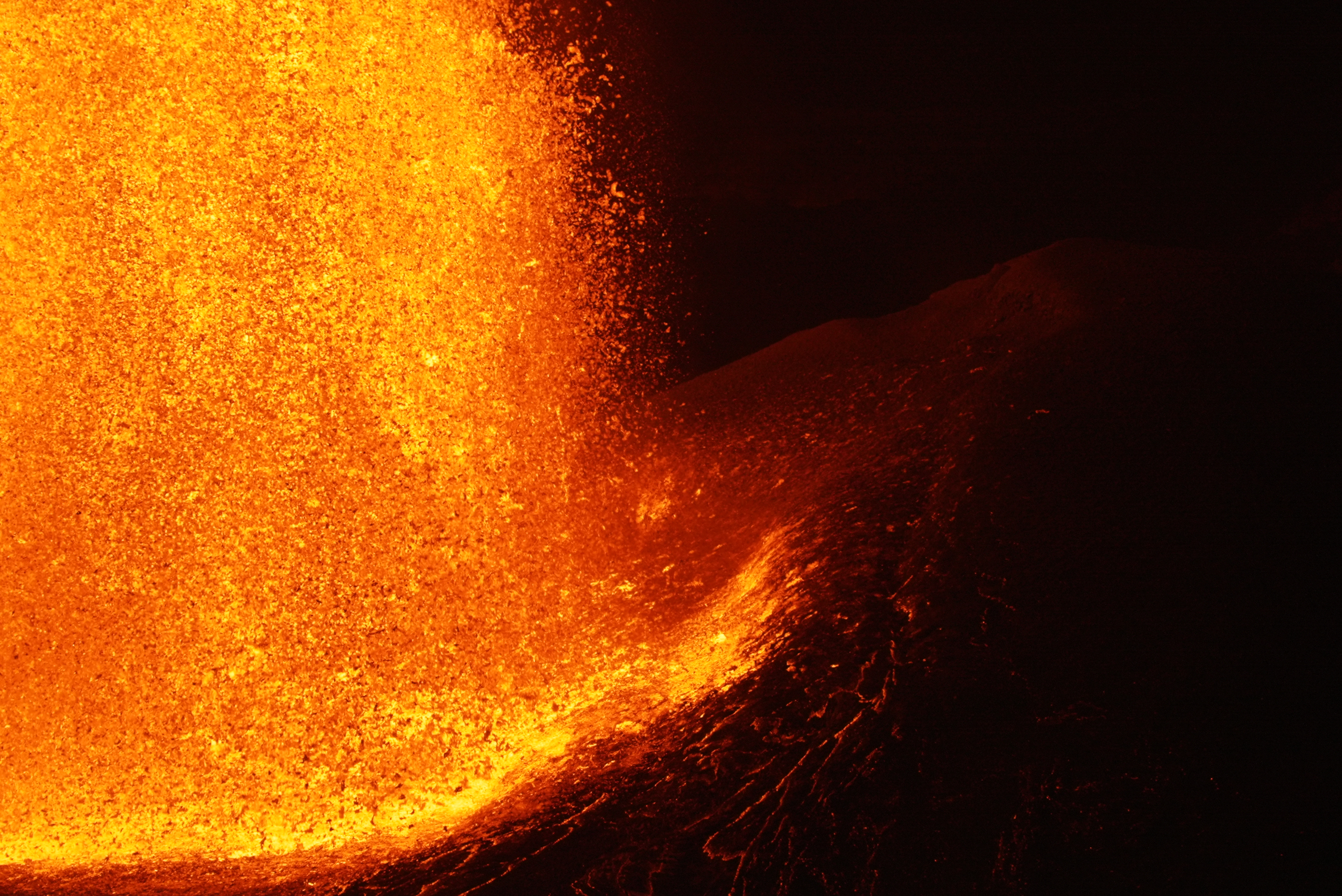 This telephoto view shows the west side of the north fountain in Halema‘uma‘u during episode 45 on April 23, 2026. Tephra deposits have built a steeply sloped cone on the west side of the vent, with the slope illuminated by the fountain. USGS photo by M. Patrick.