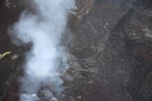 On April 29, the USGS Hawaiian Volcano Observatory undertook a helicopter surveillance flight over Halema‘uma‘u at the summit of Kīlauea volcano. At the time, the ongoing eruption was between eruptive episodes (episode 18 ended on April 22). In this photo looking down towards the east, lava is seen within north vent. The south vent is out of the field of view, but white gas (mostly water vapor) from south vent is visible at the bottom left of the photo. Lava flows from recent episodes cover most of the right half of the photo. USGS photo by N. Deligne.