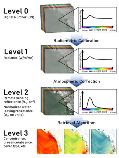 Aquatic Remote Sensing - Schematic of the levels of data and processing steps for satellite imagery