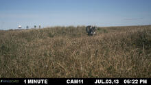 Arctic fox removes an egg from a white-fronted goose nest. Point Lonely Short Range Radar Site in background. Arctic Coastal Plain of Alaska, USA.