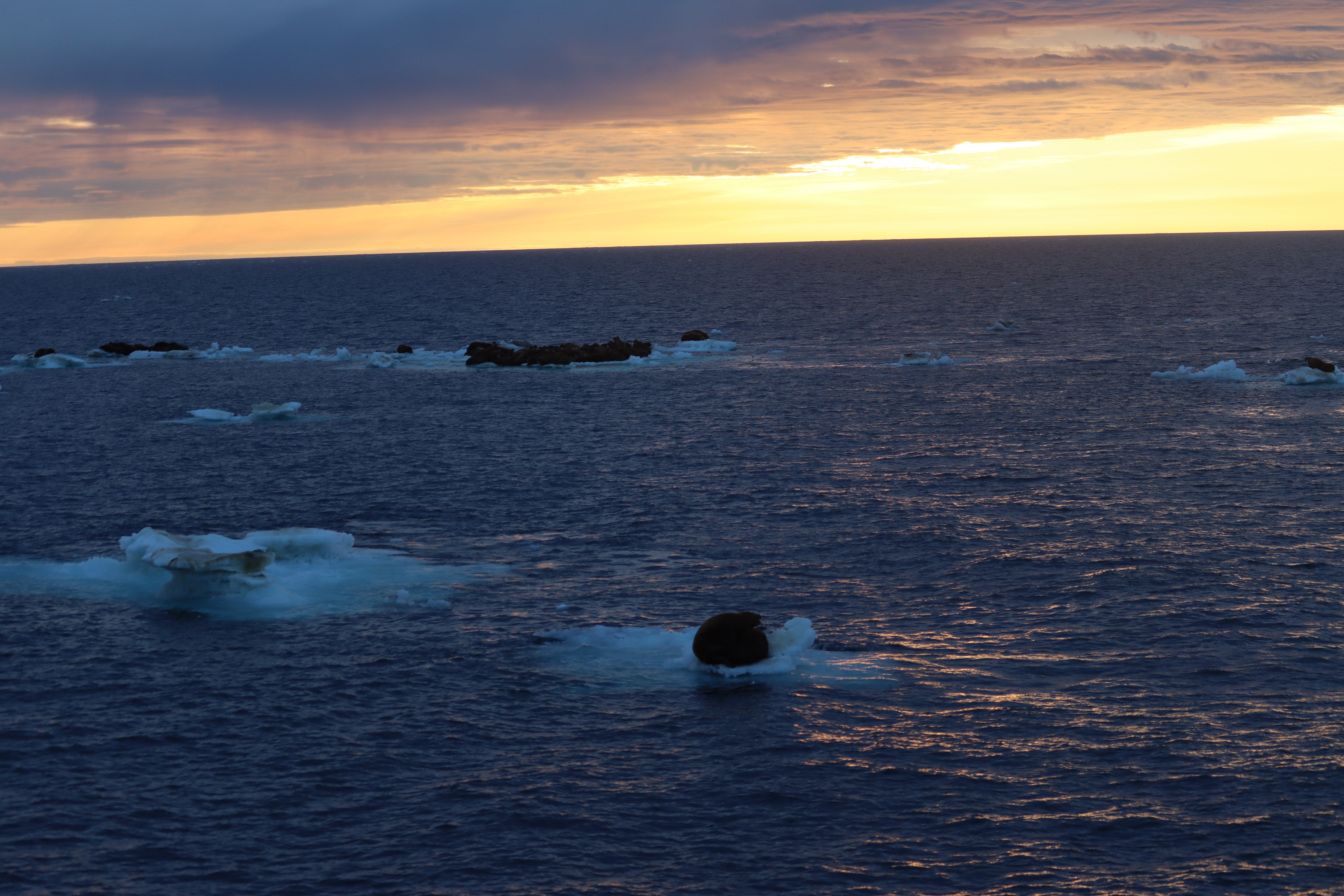 A dim light shines during the summer Arctic morning in the Chukchi Sea as groups of Pacific walruses rest. USGS and the U.S. Fish and Wildlife Service conducted joint research expeditions in 2023, 2024, and 2025 to collect data on the Pacific walrus population. Skin biopsy samples are collected from walruses hauled-out on sea ice to help scientists estimate population abundance and trend. Age structure data is also collected from walruses hauled-out on sea ice, which will help scientists estimate survival. MMPA Permit 33776D.