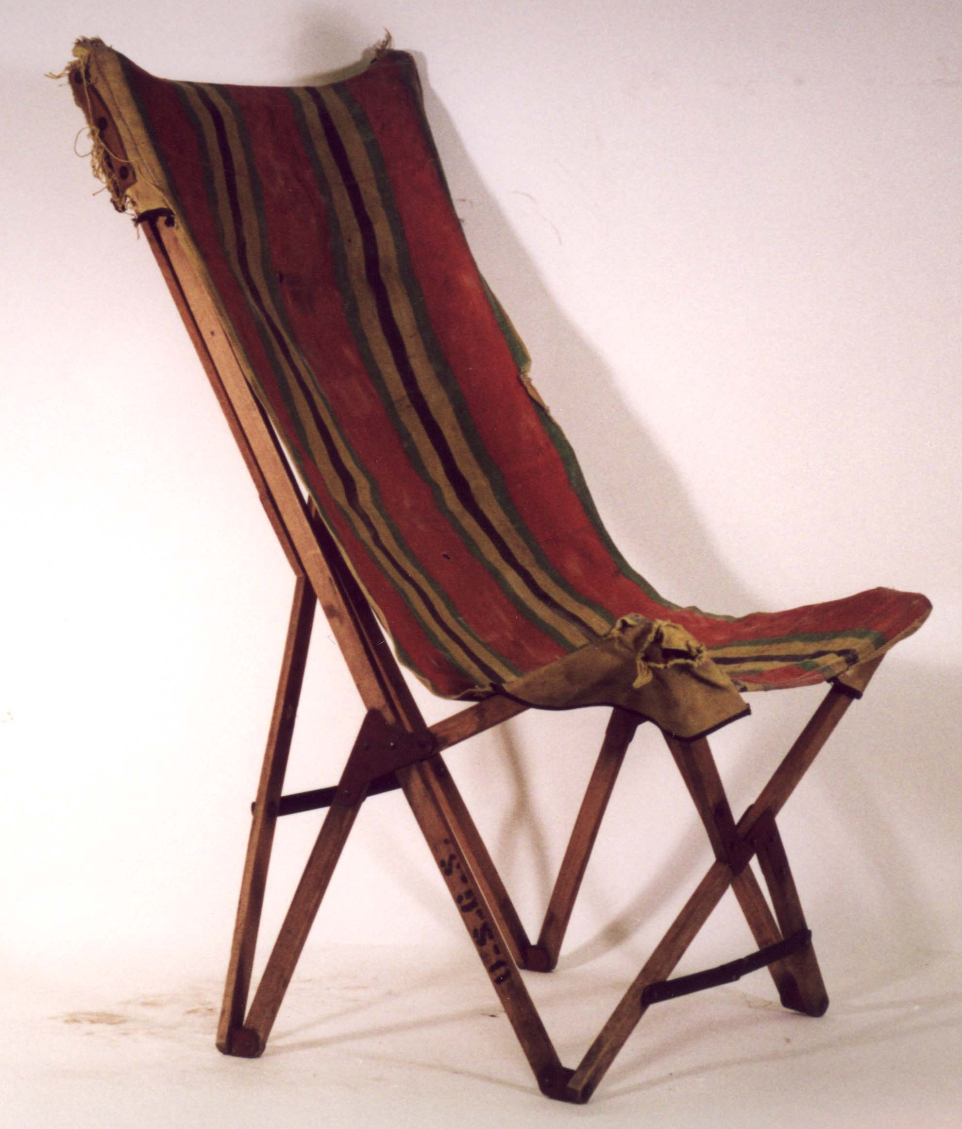 A wooden, collapsible chair from Arnold Hague's expedition. Made of sassafras wood with interchangeable canvas covers. This chair can be collapsed into a roll that is packed up and transported easily. Object ID: USGS-000031