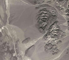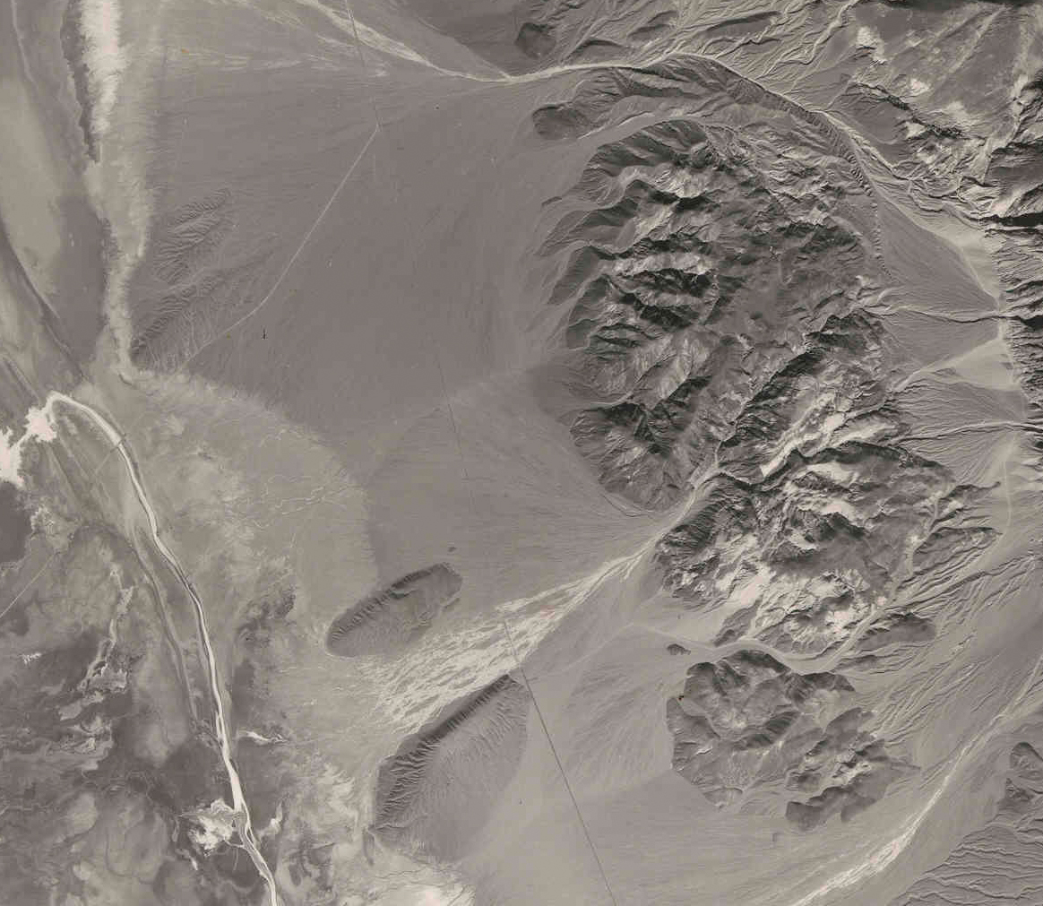 This image shows the vicinity of Artist Drive and the Devils Golf Course as it existed in 1948. The trace of the West Side Road can be seen in the lower right hand corner where it crosses the Devils Golf Course, the name for the saltpan in central Death Valley. The white trace of the active valley trunk stream can be seen across the bottom of the image. It is white primarily because of salt (halite) deposition, whereas the older deposits are dark because of dust, organic residues, and other mineral impurities in the salt. Scale (1:48,000).