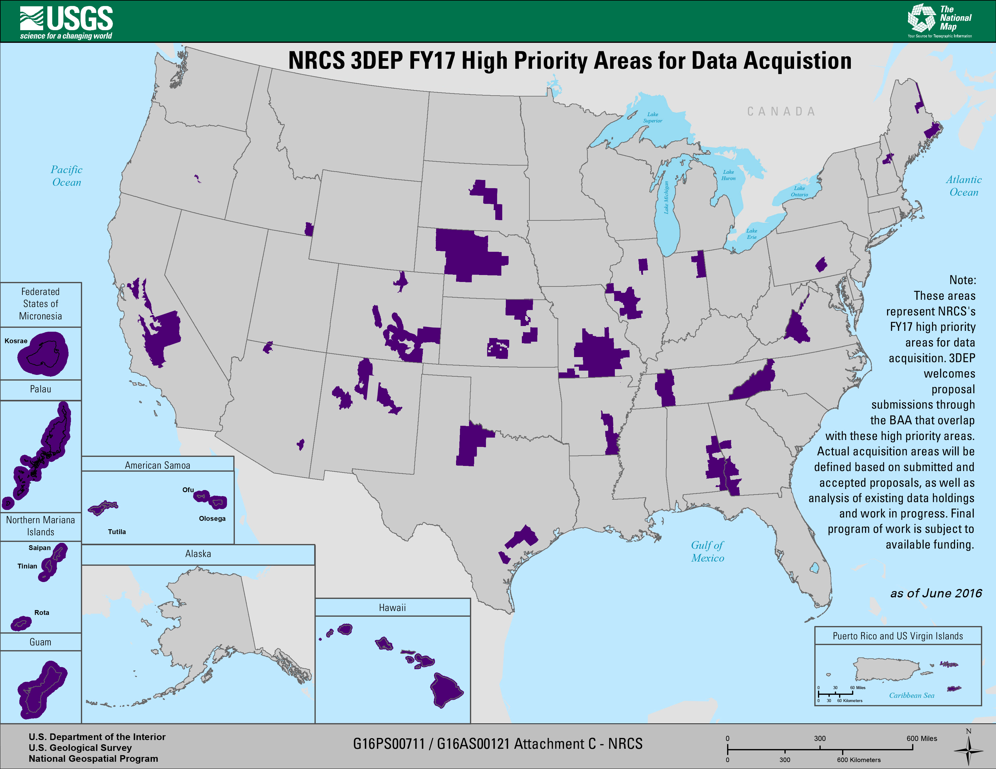 These areas represent NRCS's FY17 high priority areas for data acquisition as of June 2016. 3DEP welcomes proposal submissions through the BAA that overlap with these high priority areas. Actual acquisition areas will be defined based on submitted and accepted proposals, as well as analysis of existing data holdings and work in progress. Final program of work is subject to available funding