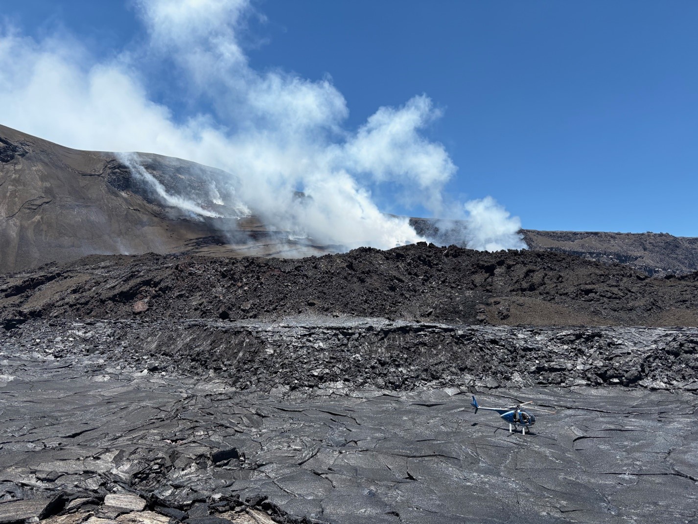 August 13 - View of the lava/tephra pile from the sampling location on the temporary fissure from episode 30. The helicopter landed on the crater floor on the new pāhoehoe lava that formed while the talus slope of the fissure vent was erupting.