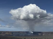 A helicopter can be seen in the upper left portion of the photo, with USGS Hawaiian Volcano Observatory geologists onboard conducting a photogrammetric survey of Halema‘uma‘u crater floor following the episode 31 lava fountaining on August 22-23, 2025. The passive outgassing plume originates from the vent complex that has been active in the current eruption. USGS photo by M. Patrick.