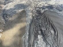 During a Kīlauea monitoring overflight on August 25, 2025, USGS Hawaiian Volcano Observatory field crews documented the proximal channel that fed lava flows from the north vent to the floor of Halema‘uma‘u during episode 31. This image, looking to the north (the north vent is just out of sight to the bottom of the photo), shows the proximal Pāhoehoe channel flanked by lighter brown tephra deposits to the left and right. USGS photo by K. Lynn.