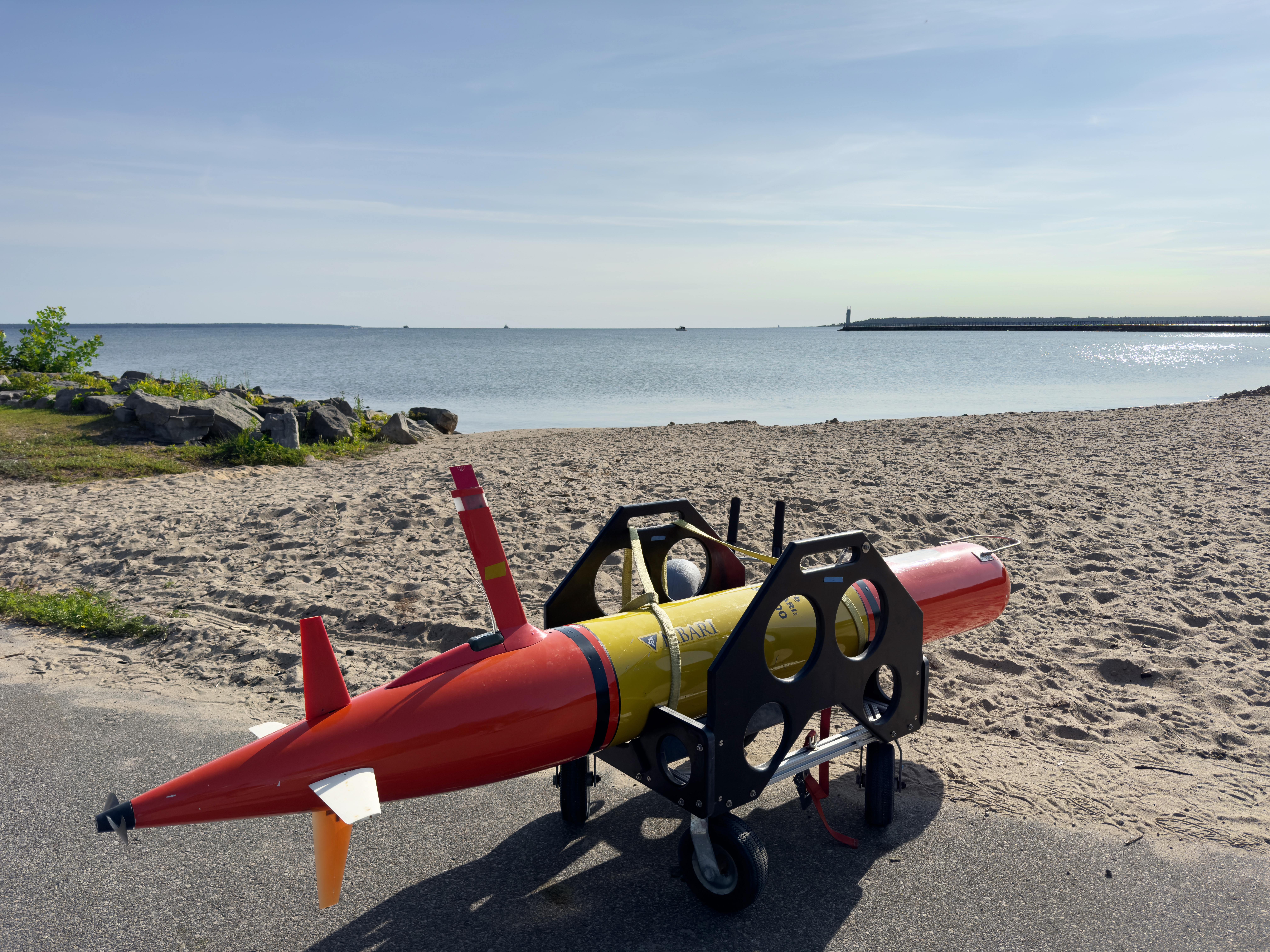 USGS researchers (GLSC; Ann Arbor, Michigan) partner with Monterey Bay Aquarium Research Institute (MBARI) to launch the Triton Long-range Autonomous Underwater Vehicle (LRAUV) in Lake Huron near Cheboygan, Michigan. LRAUVs are being used to assess the accuracy of USGS's fisheries monitoring efforts from conventional vessels in an effort to improve the quality of data provided to fisheries management partners. Photo Credit: Alden Tilley, USGS - GLSC.