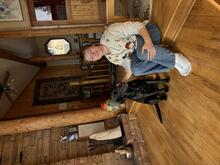 An image of Avery Rice smiling in a home by a black dog. Staff profile image.