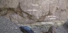 Basal breccia and clastic dikes at Haycock Mountain, near the southern terminus of the Markagunt gravity slide.