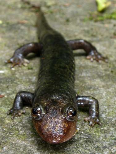 This black-bellied salamander (Desmognathus quadramaculatus) was found in the Citico Creek Wilderness, Cherokee National Forest, Tennessee.