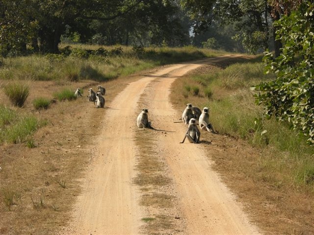 A small troop of black-faced langurs sitting along a dirt road in the sunlight.