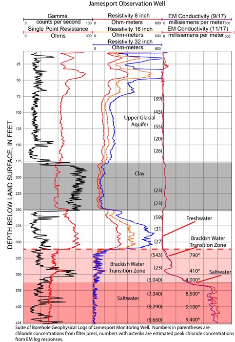 Borehole-Geophysical Log Suite Collected from a Deep Test Borehole at Queens, New York: The figure above shows a borehole-geophysical log suite collected by the USGS from test well Q-3655 in May, 1989 a deep test boring located near the western boundary of John F. Kennedy International Airport in Queens, NY. The calculated EM conductivity log clearly delineates saltwater intrusion in the upper glacial, Jameco, Magothy, and Lloyd aquifers. Using the USGS EM conductivity equation, estimated chloride concentrations of 20,000 mg/L in the Magothy aquifer and 15,000 mg/L in the Lloyd aquifer were calculated (Public domain).