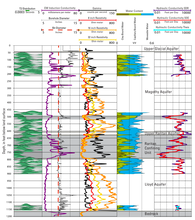 A suite of borehole geophysical logs collected at well N 14421.1 including gamma, electromagnetic-induction conductivity (EM), electric, induction, caliper, and nuclear magnetic resonance (NMR) logs. NMR data indicates only the lowest 50 feet of the Raritan Confining Unit has properties of a clay.