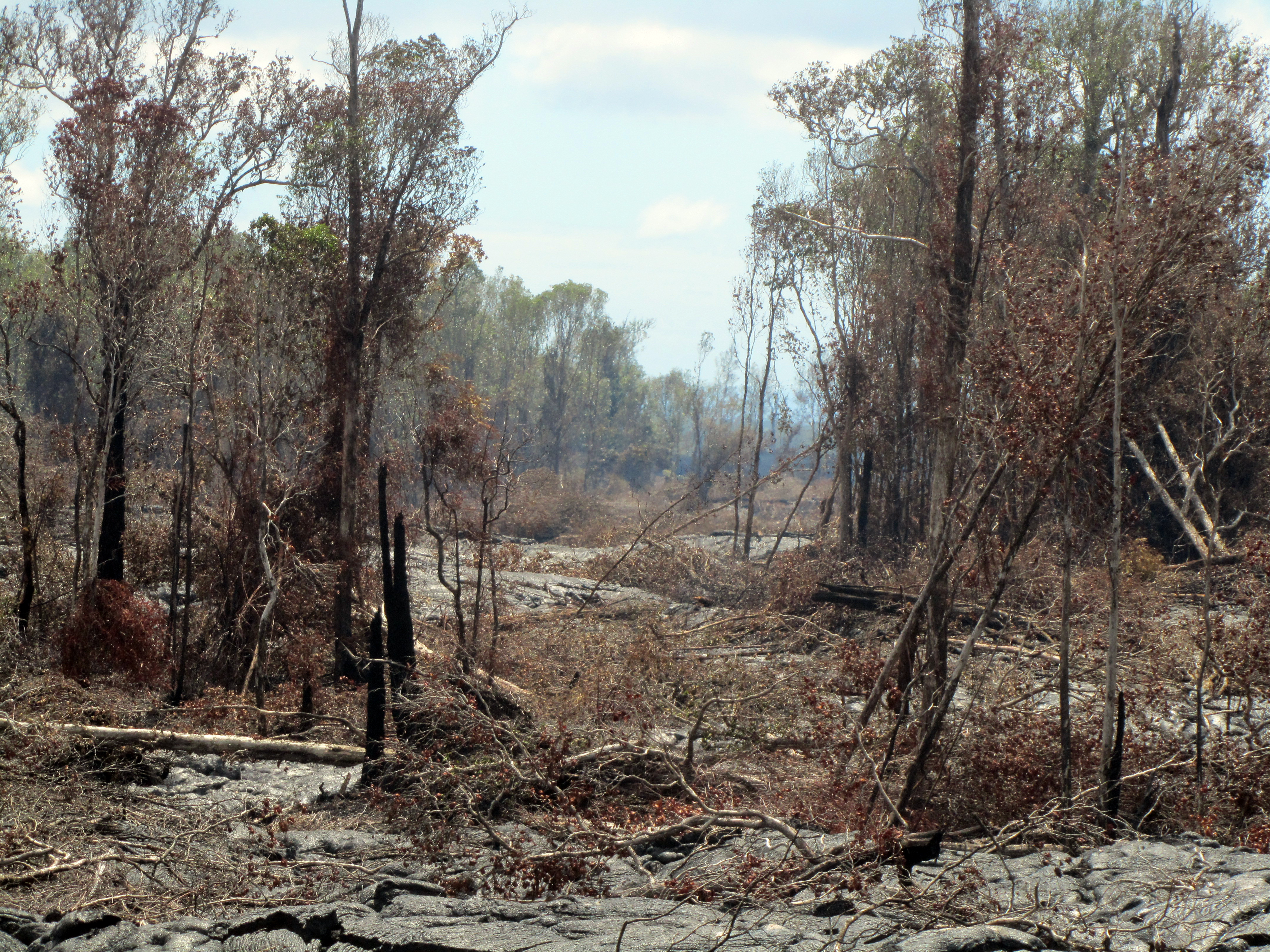 Breakouts remain scattered along the June 27th lava flow, and are not just limited to the flow front. Here surface flows have recently cut a swath through thick forest.