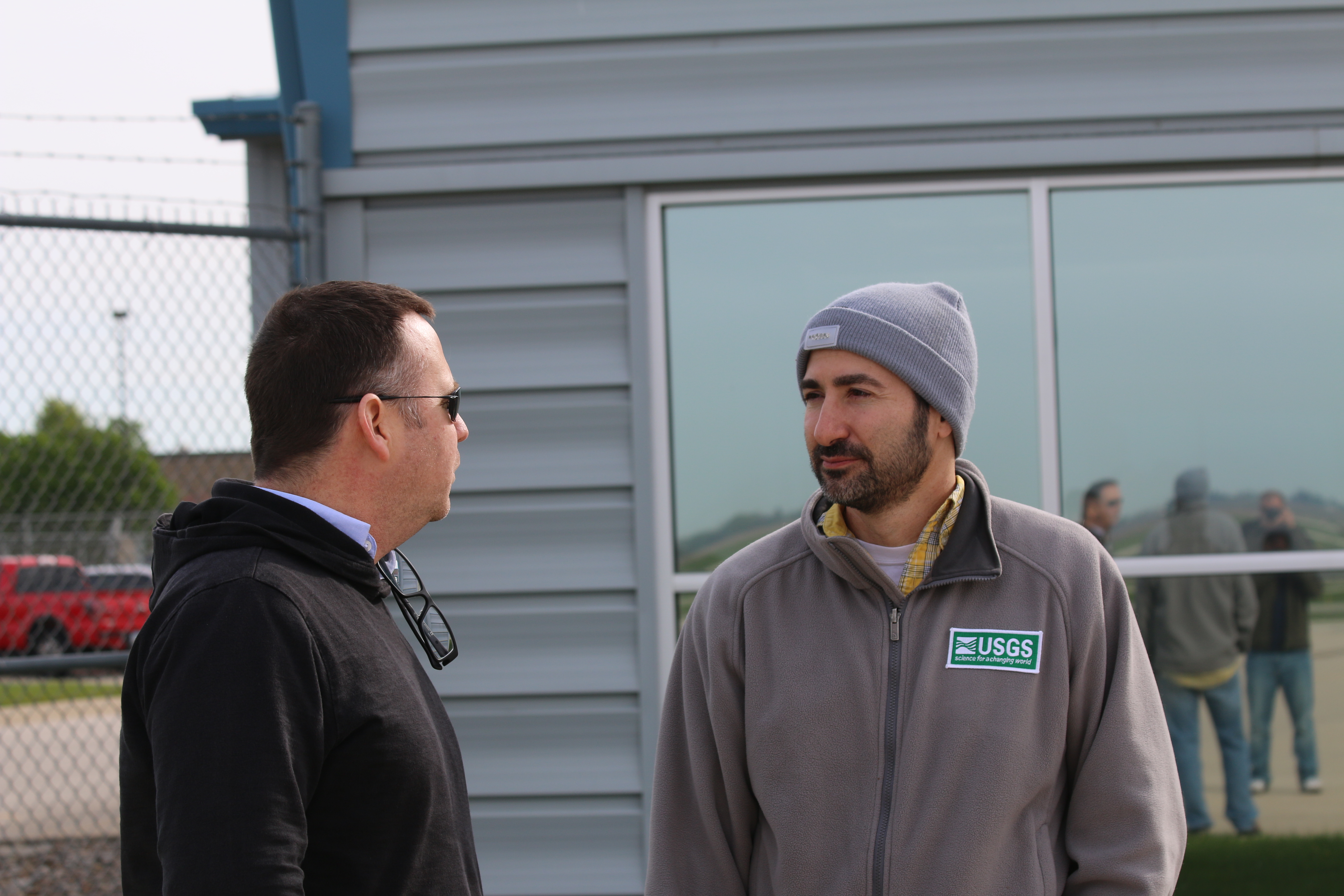 Brett Robinson, contractor (left) and Eddie Haj, USGS (right) discuss flight changes and data collection protocols.
