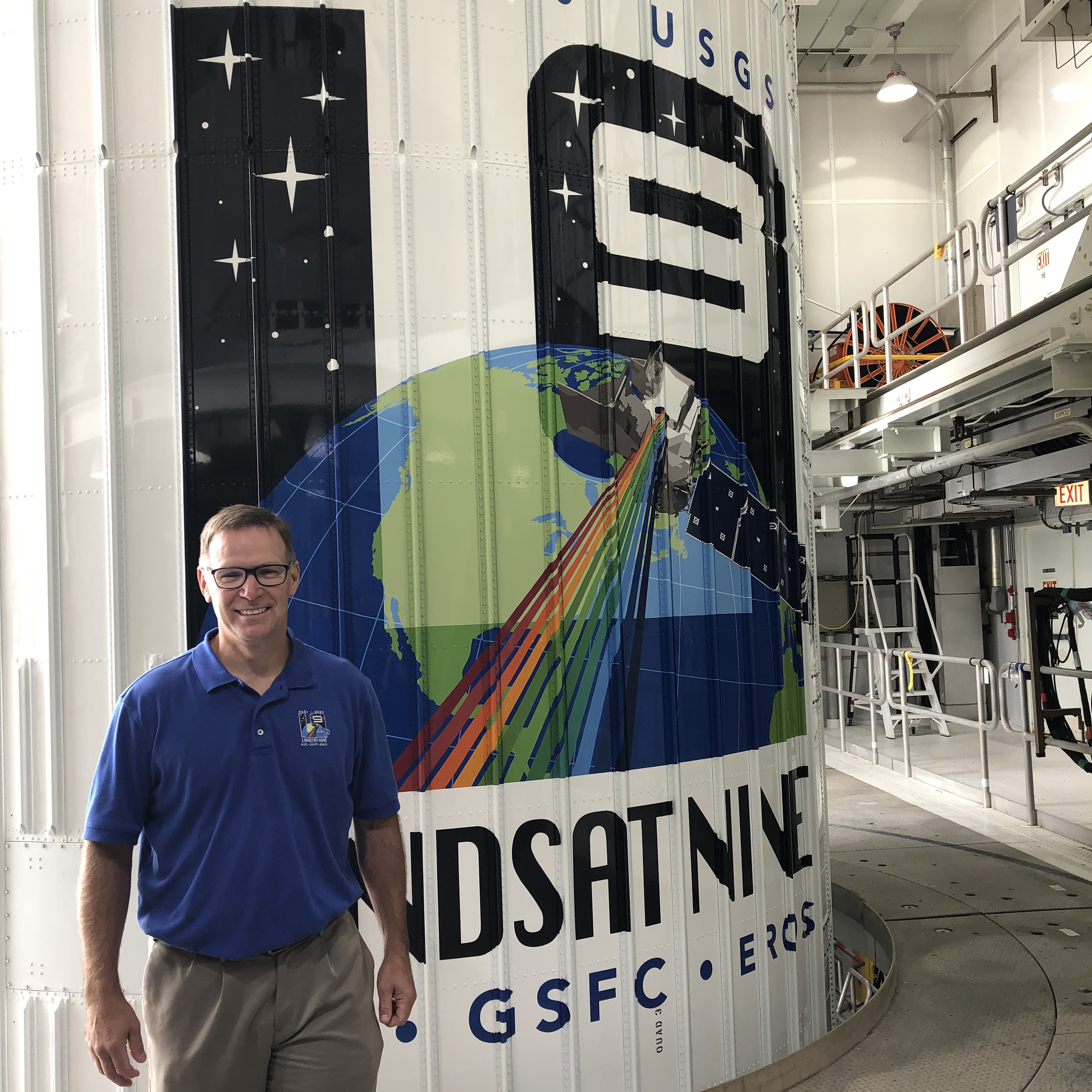 Brian Sauer with the Landsat 9 display in the background. Brian Sauer is the Landsat Development Manager and Supervisory Computer Scientist, at the Earth Resources Observation and Science (EROS) center.