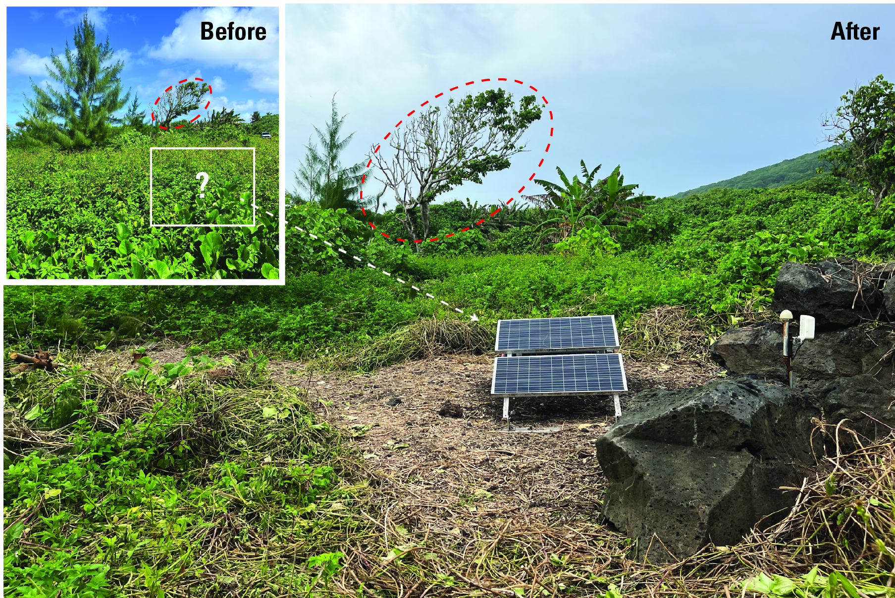Broadband seismometer site on eastern Taʻū, American Samoa, before and after it was cleared of vegetation.