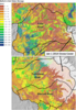 Figure 2. Close-ups of the Yuba River basin (top) and the Tuolumne and Merced River basins (bottom) showing calculated soil-water deficit as of January 1, 2014, and including simulated snow cover for each basin.