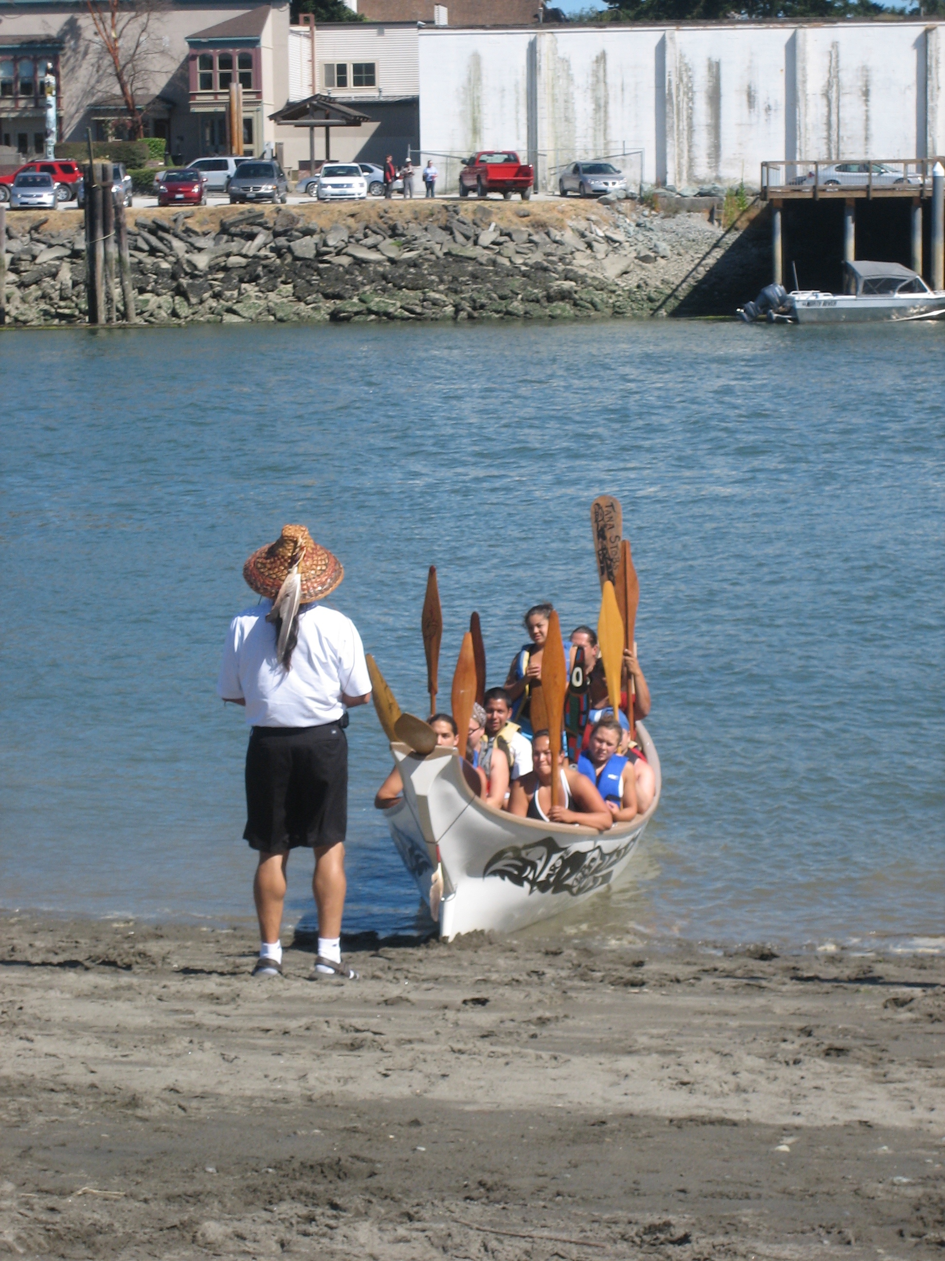 A canoe family arriving and being welcomed and granted permission from Brian Cladoosby, Swinomish Tribe chairman, to come ashore at the the beach at the Swinomish Tribal Community Center