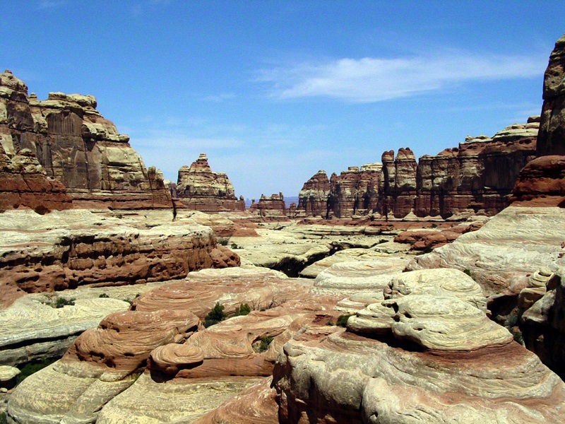 The headwater region of Elephant Canyon is mostly barren slickrock on the Cedar Mesa Sandstone.