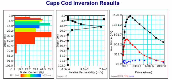 These graphs show, from left to right: water content and T1 decay time, in percent, with depth; relative permeability in meters per second, with depth; and the change in amplitude of the signal with time.