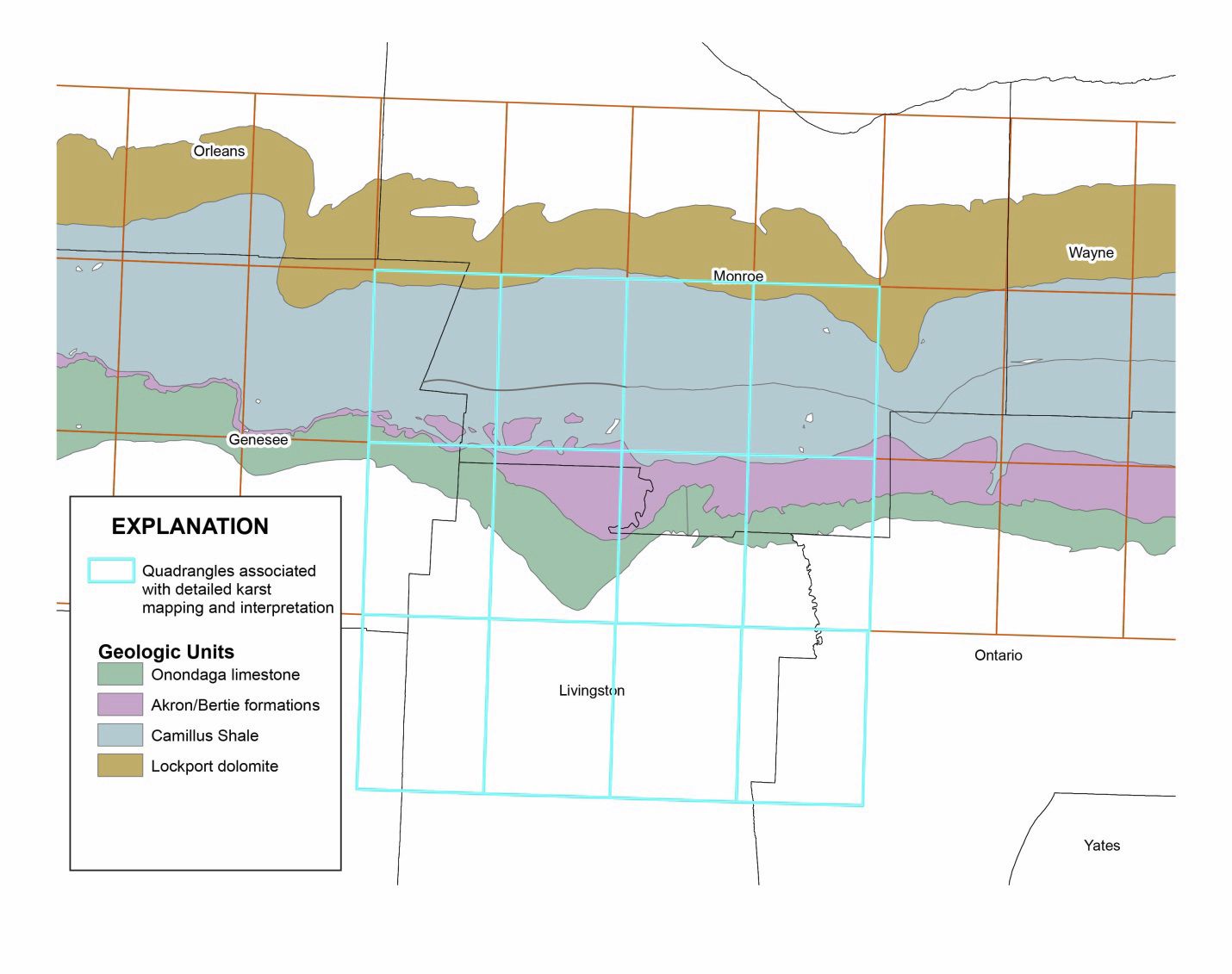 Carbonate-rock units and associated 7.5 minute quadrangle boundary area that will be studied for karst and focused recharge delineation, analysis, and interpretation in Livingston and Monroe Counties, New York