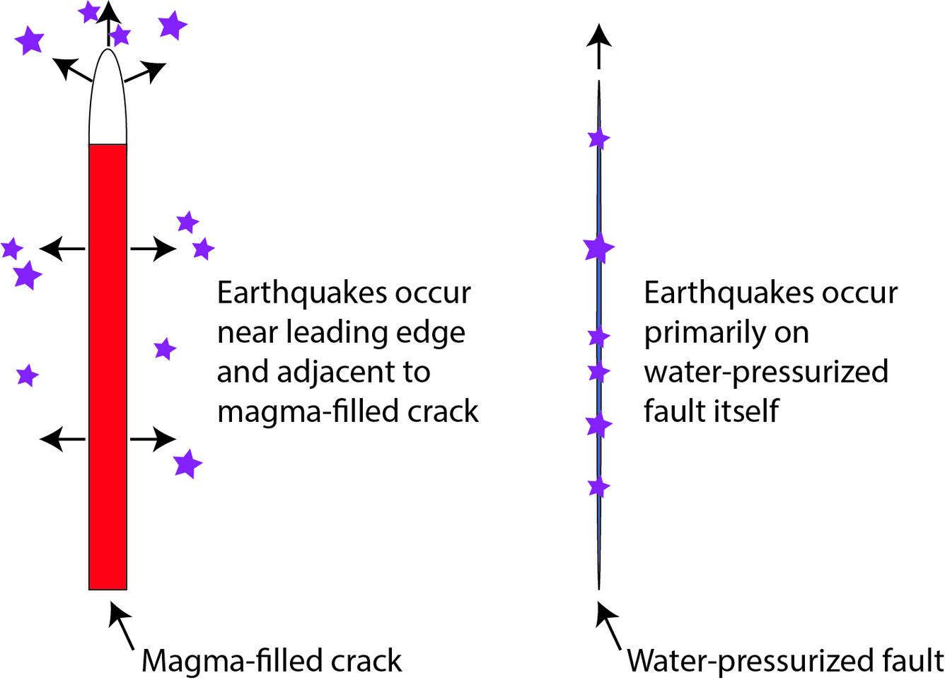 Simplified cartoon showing differences between patterns of earthquakes expected for a swarm driven by a magma-filled crack (left) versus one driven by pressurized water in a fault (right).