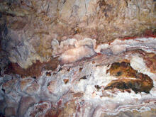 On close inspection, most of the crystals in Jewel Cave are a variety of calcite (CaCO3) called dogtooth spar. Banded layers of crystalline calcite are called travertine or onyx. The crystals are not speleothems because they formed under water. The crystals precipitated from groundwater that was supersaturated relative to calcium carbonate [calcite].