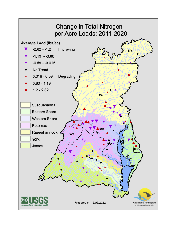 Change in Total Nitrogen per Acre Loads in the Chesapeake Bay Watershed 2011-2020