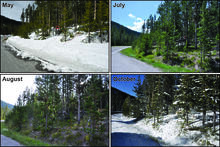 Changes in snow conditions at a gravity station in Yellowstone National Park in 2017. Each photo is taken from about the same location in May, July, August, and October of that year. The red circle in the May photograph shows the location of the gravity station in this area, which is near Craig Pass, a few miles southeast of Old Faithful.