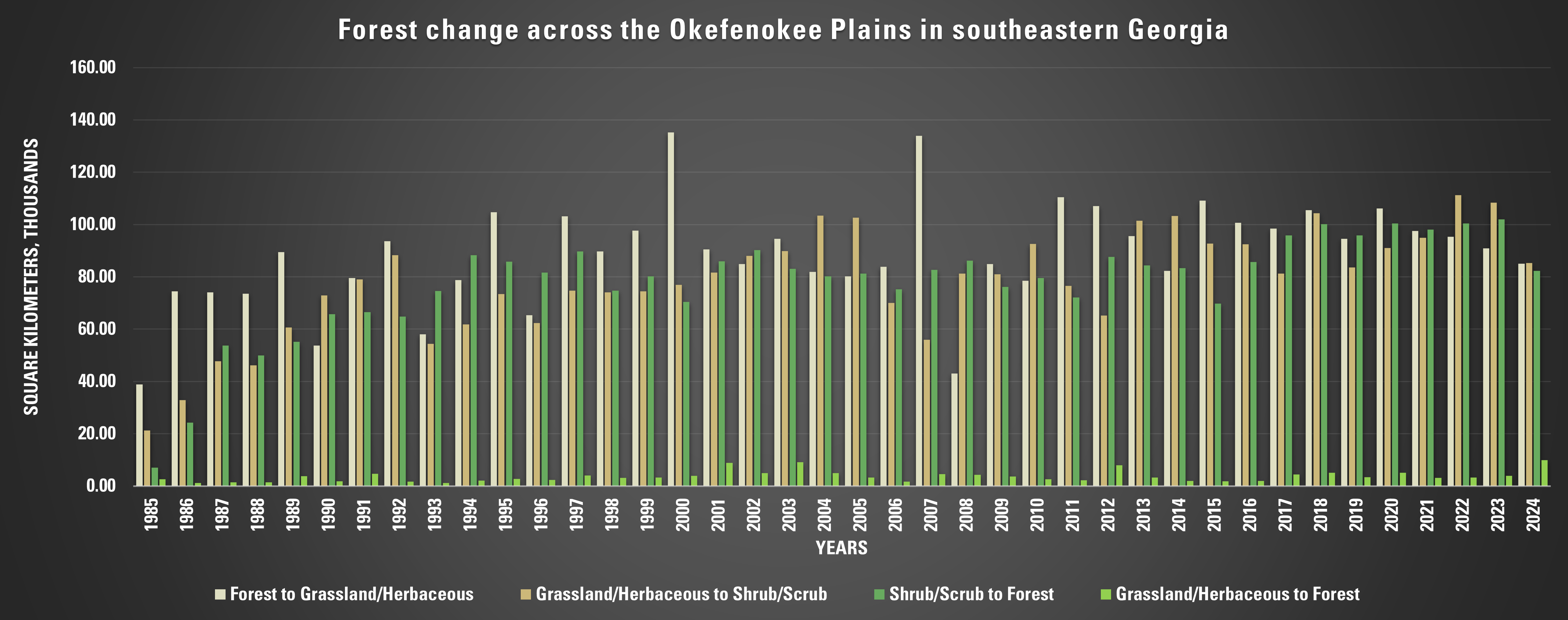 This chart shows the amount of forest change across the Okefenokee Plains for each year from 1985-2024. The change is shown in four categories, transitions from forest cover to herbaceous species like grasses, herbaceous to shrubland, shrubland back to forest, and less typically, herbaceous to forest. The amount is measured by the number of Annual National Land Cover Database (NLCD) pixels that show each change (pixels are 30-meter-by-30-meter areas on the ground, or 98 by 98 feet).