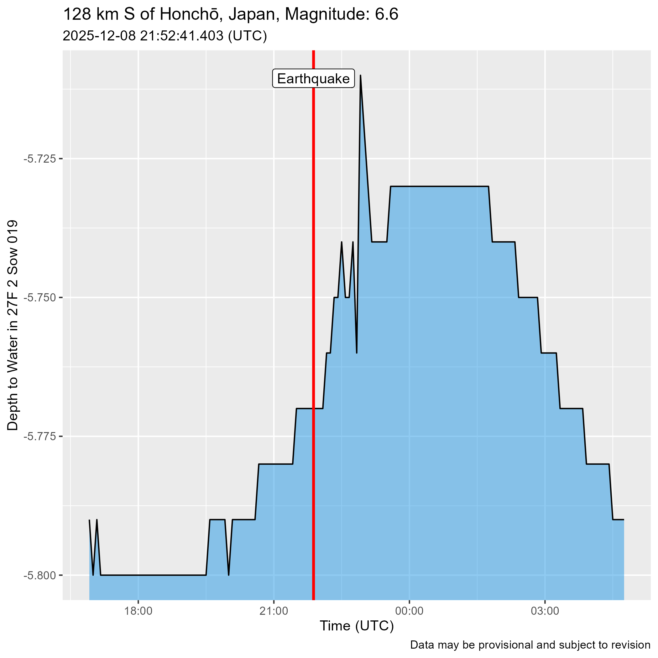 Christiansburg Well Hydrograph after Magnitude 6.6 Earthquake 128 km S of Honchō, Japan