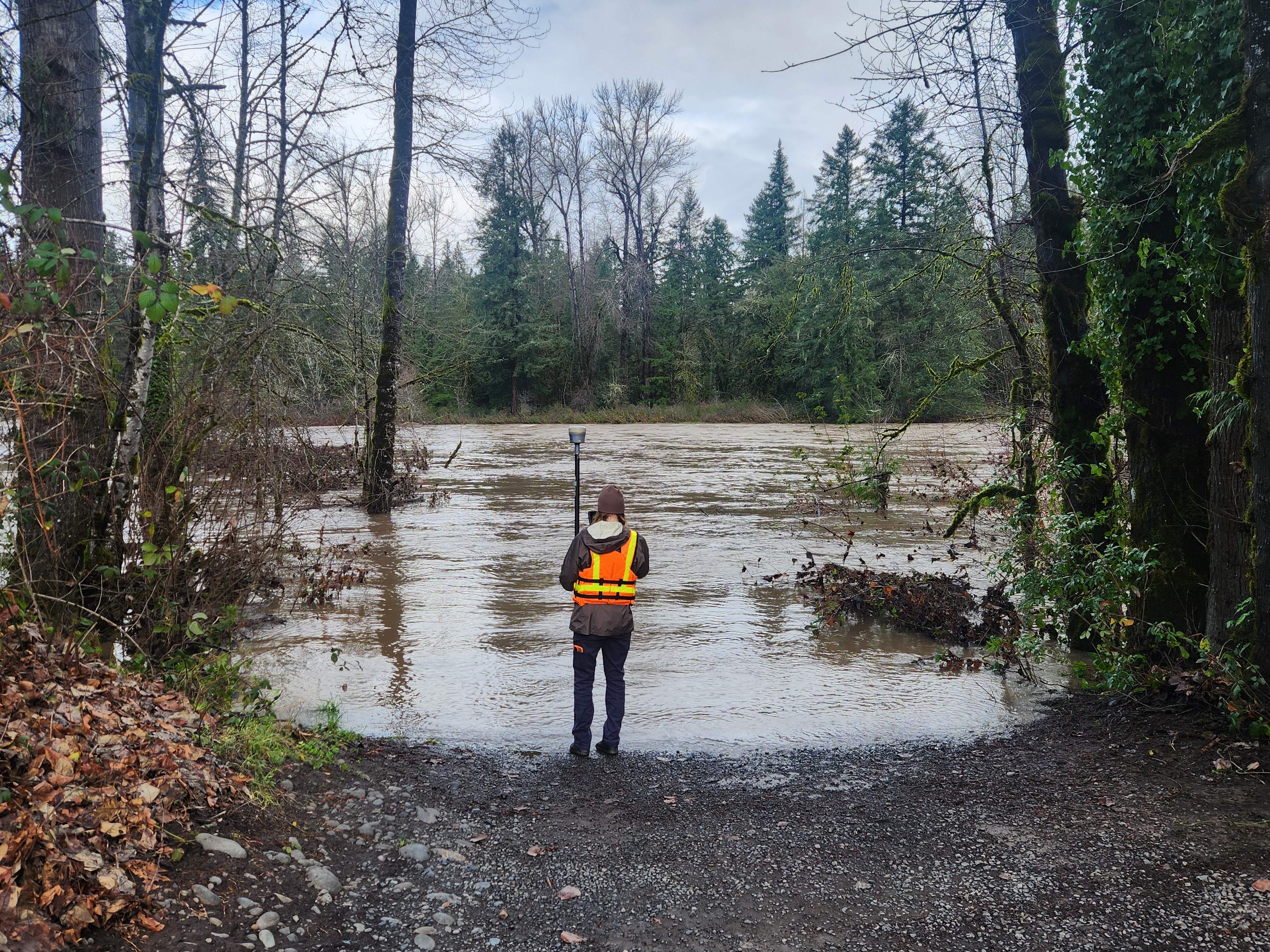 USGS scientist, wearing a personal protection device, or PFD, surveys water levels and debris line on the Clackamas River, Milo McIver park boat ramp. These measurements are used to validate a 2D hydraulic model of the Clackamas River. These new high-resolution models will help the USGS and our partners address various water resource and hazard issues along the Clackamas.