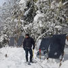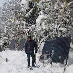 Clearing snow from solar panels which provide power to an instream Passive Integrated Transponder tag detection system in the Wind River, WA. The system detects tagged juvenile and adult Steelhead for population assessment and migratory data.