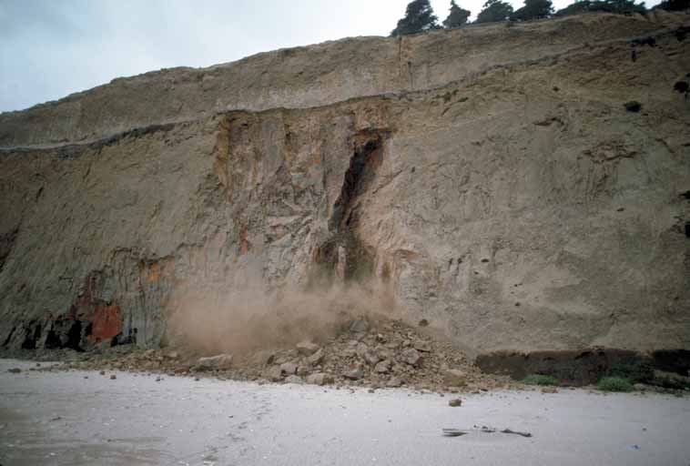 Cliff failure north of Tunitas Creek. This face continued to slide for a few days after the earthquake. The event in progress exposed dark cliff material.