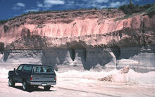 In this photograph, the Mesa Falls ash-flow tuff is easily distinguished from the lighter-colored, underlying, fallout ash. This area was near the depositional margin of the ash flows and consequently the ash-flow tuff is nonwelded and contained abundant large pumice blocks. The tuff was deposited during a large eruption that produced the Henrys Fork caldera southwest of Yellowstone National Park 1.2 million years ago. Photograph by Dan Dzurisin.