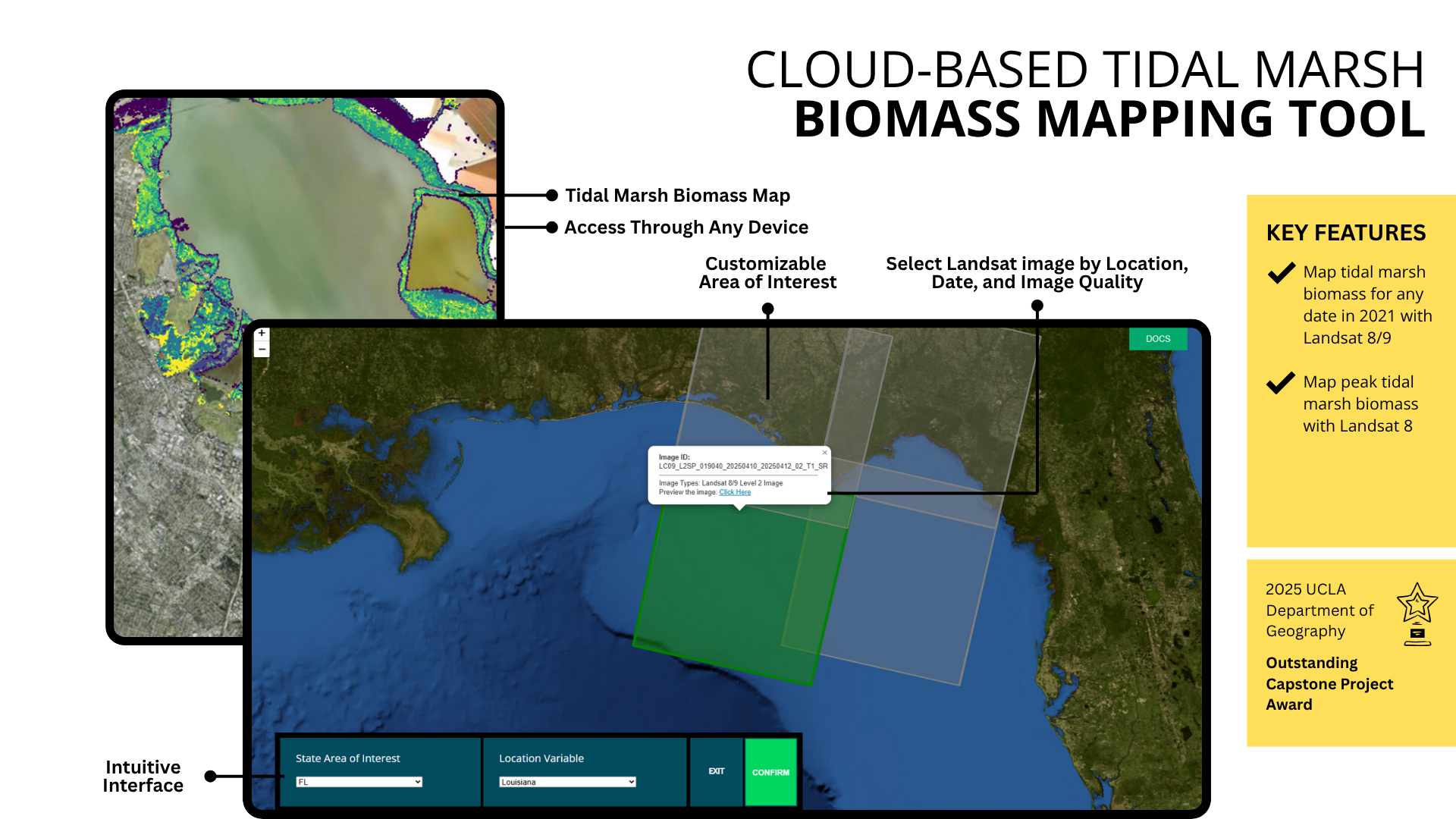 The graphical user interface of the Cloud-based tidal marsh biomass mapping tool that highlights features and map outputs.
