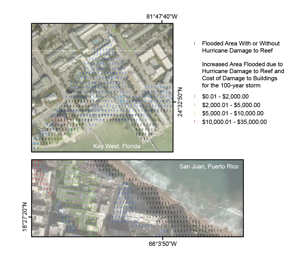 Example increase in coastal flooding extent and the annual cost of flood damage to buildings caused by hurricane-induced damage to the coral reefs off Key West, Florida, and San Juan, Puerto Rico.