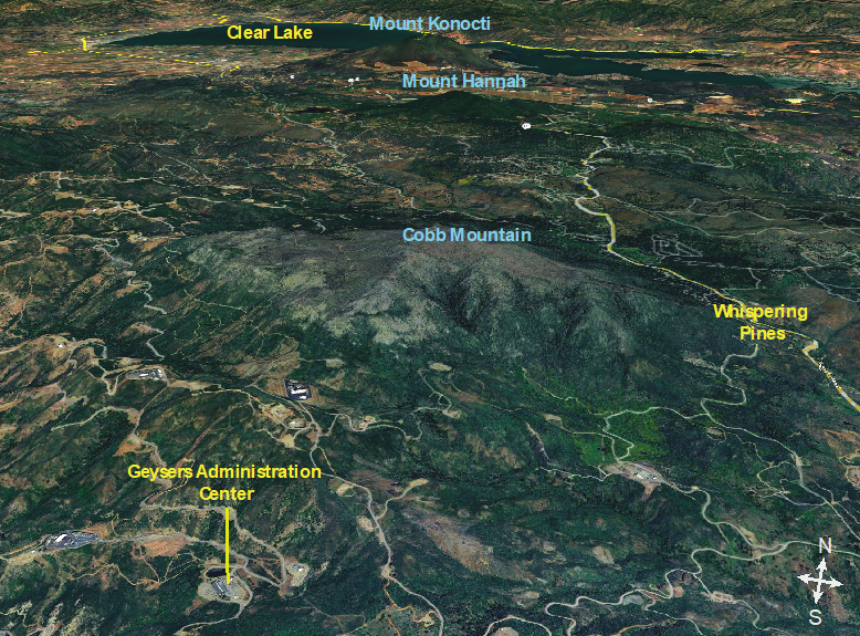 Extensive well drilling and geophysical modeling associated with development of the Geysers geothermal resource, which wraps around the northwest and south sides of Cobb Mountain, has revealed an interesting feature beneath the mountain, as well. This subsurface rock sampling and imaging has located intrusive igneous body, called the “Felsite,” which turns out to be generally the same age and chemical composition as the lavas of Cobb Mountain. The Felsite is much larger than Cobb Mountain and is thought to be in the unerupted equivalent to the volcanic flows present at the surface. This image of Cobb Mountain is looking approximately northward. A few powerplants associated with the Geysers geothermal complex can be seen, as can Mount Hannah and Mount Konocti, both of which are comprised of volcanic rocks of the Clear Lake volcanic field. Google Earth image illustrated by Seth Burgess.