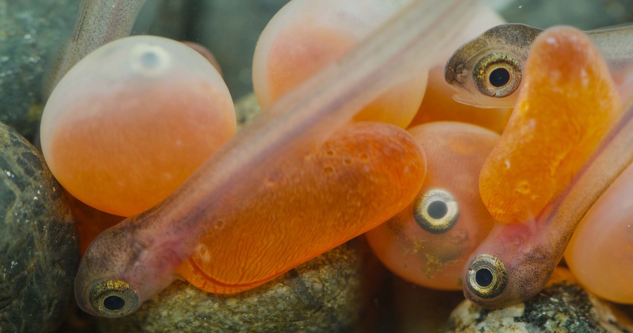Coho salmon eggs hatching into alevins. An alevin is a newly hatched salmon with the yolk sac still attached.