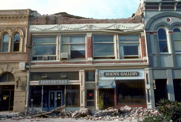 Collapsed unreinforced-brick facade, Pacific Garden Mall.