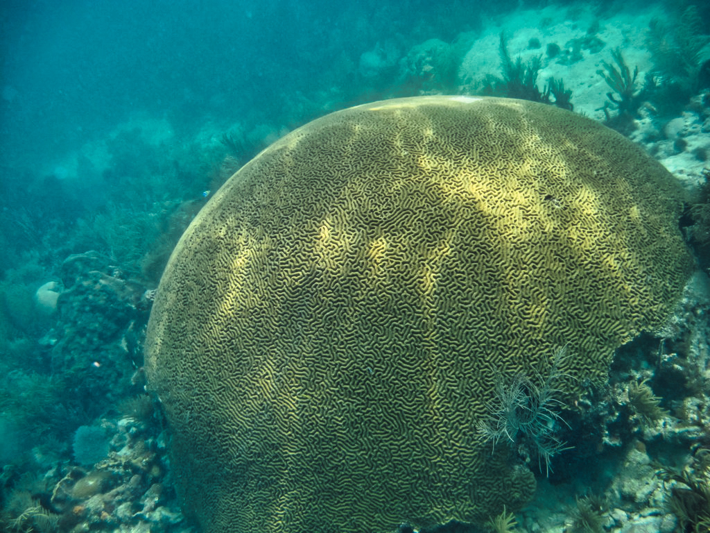 A large head of Colpophyllia natans coral sits in shallow water in the Florida Keys.