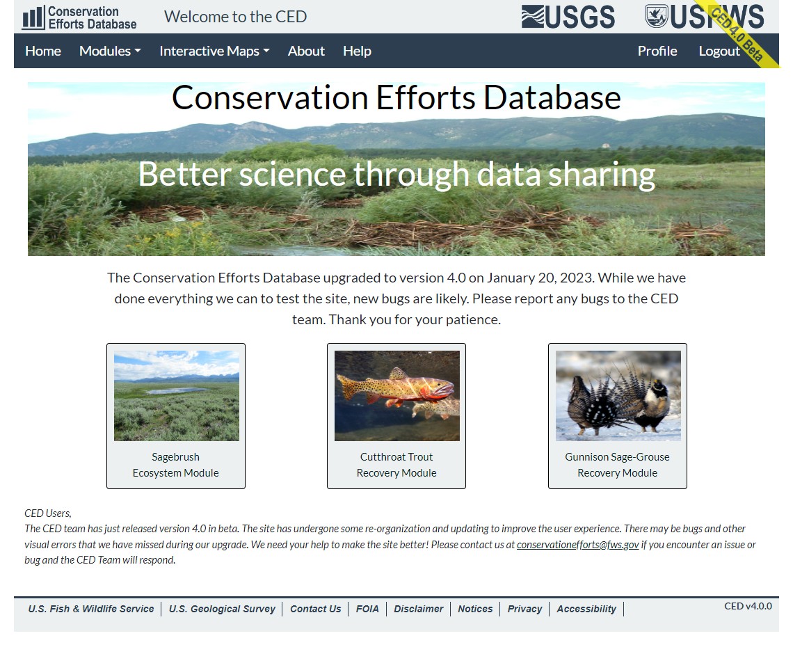 Conservation Efforts Database (CED). Better science through data sharing. Still shot of the CED webpage. Thumbnail for CED videos.