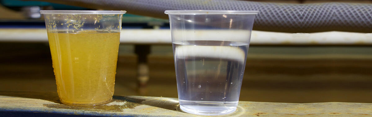 Water with flocculants added (left cup) prior to entering the water clarifiers in the treatment plant and the resulting water (right cup) before re-entry into Cement Creek.
