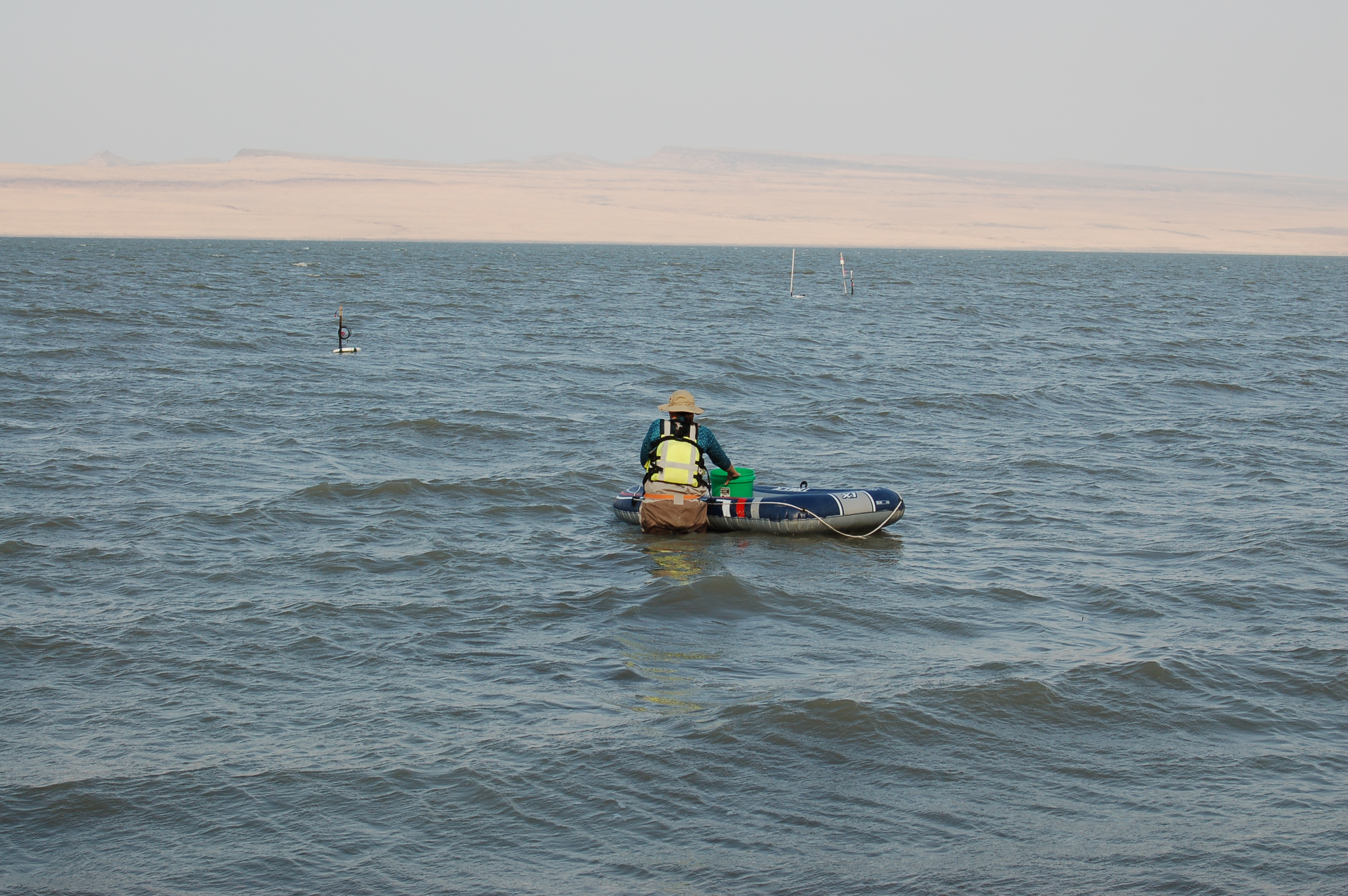 A USGS scientist wades into Lake Abert to service continuous water quality monitoring equipment.