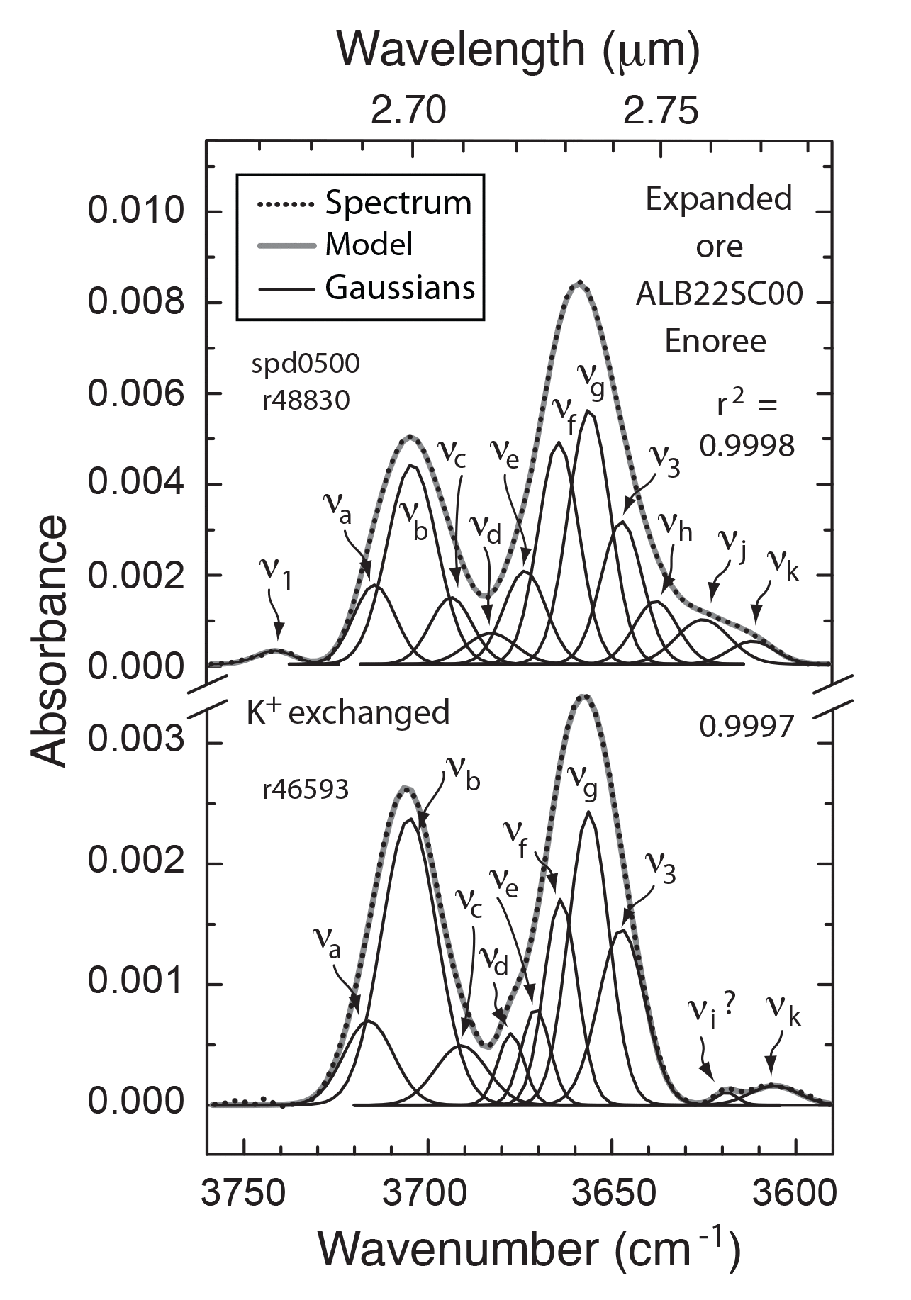 Figure A6. Continuum-removed absorbance spectra of an unexpanded Mg-vermiculite VTx-1sample from Llano, Texas, in the (a) OH stretch and (b) cation-OH bend fundamental regions showing absorptions and their deconvolution into symmetrical Gaussians.