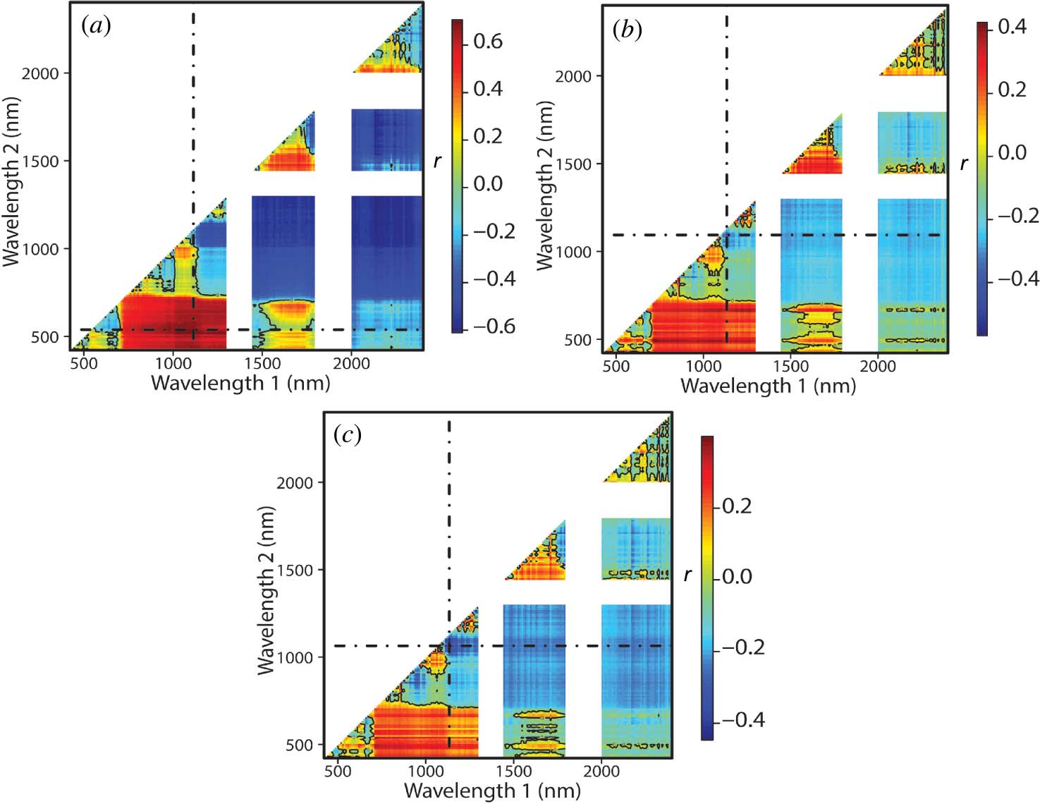 Dashed lines intersect at band combinations with the greatest r.