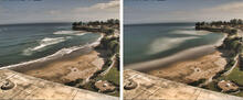Cowells Beach in Santa Cruz, California, from a 10-minute video shot on May 6, 2017. Snapshot on the left; time-averaged image on the right.