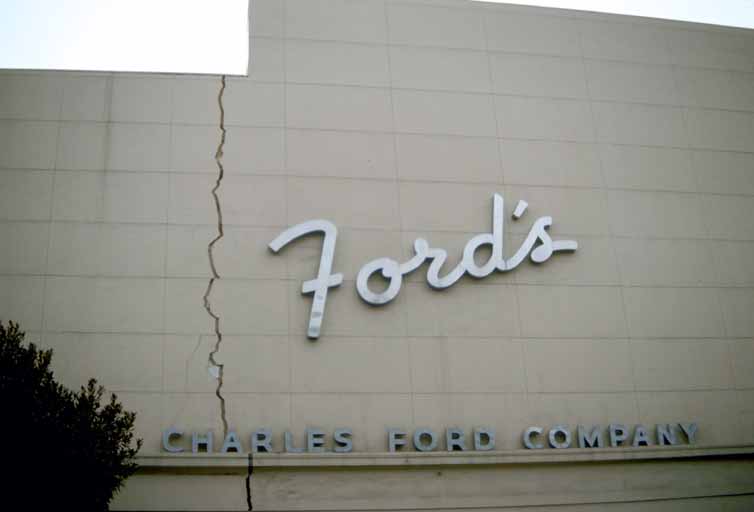 Crack down front of Ford's Department Store, downtown Watsonville. Although this fracture appears minor, the building was significantly damaged.